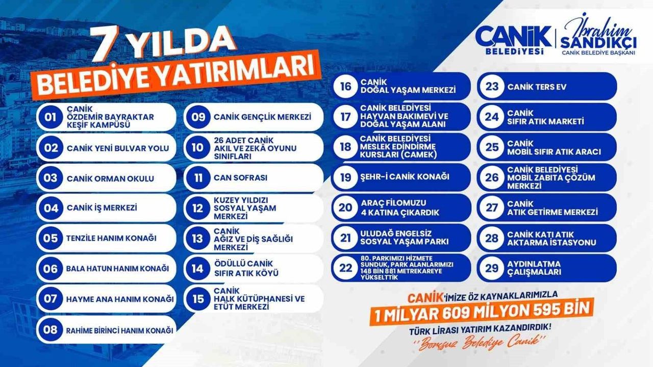 Samsun'un Canik Belediye Başkanı İbrahim Sandıkçı, son 7 yılda ilçeye 1 milyar 609 milyon 595 bin liralık yatırım kazandırdıklarını açıkladı.