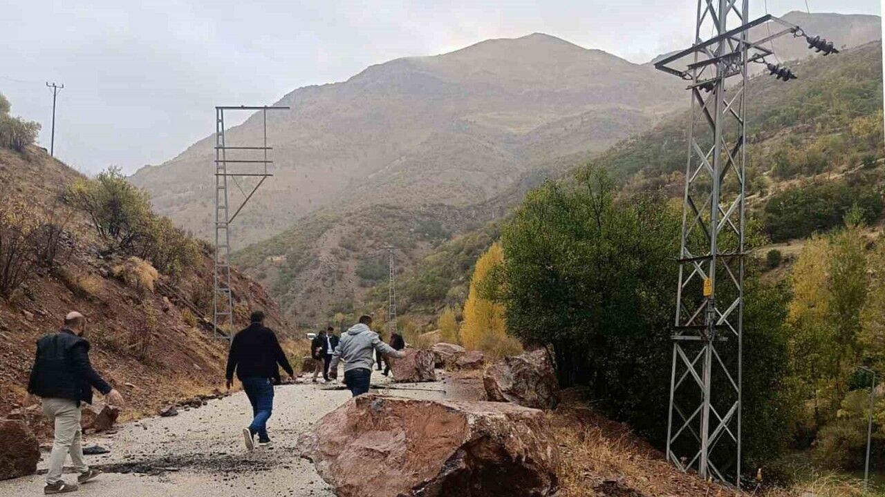 Van’ın Çatak ilçesinde dünden bu yana etkili olan yağışlar nedeniyle dağlık alandan kopan kaya parçaları yola düştü.