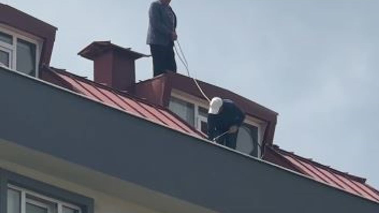 Olay, dün Beylikdüzü Adnan Kahveci Mahallesi’nde yaşandı. Bir binanın çatısına tadilat yapmak için çıkan adam, başka birinin tuttuğu ve beline bağladığı iple güvenlik önlemi aldı. Çatıdan düşme tehlikesine aldırmadan işine devam eden şahsın o anları ise bir vatandaşın cep telefonunu kamerasına yansıdı.