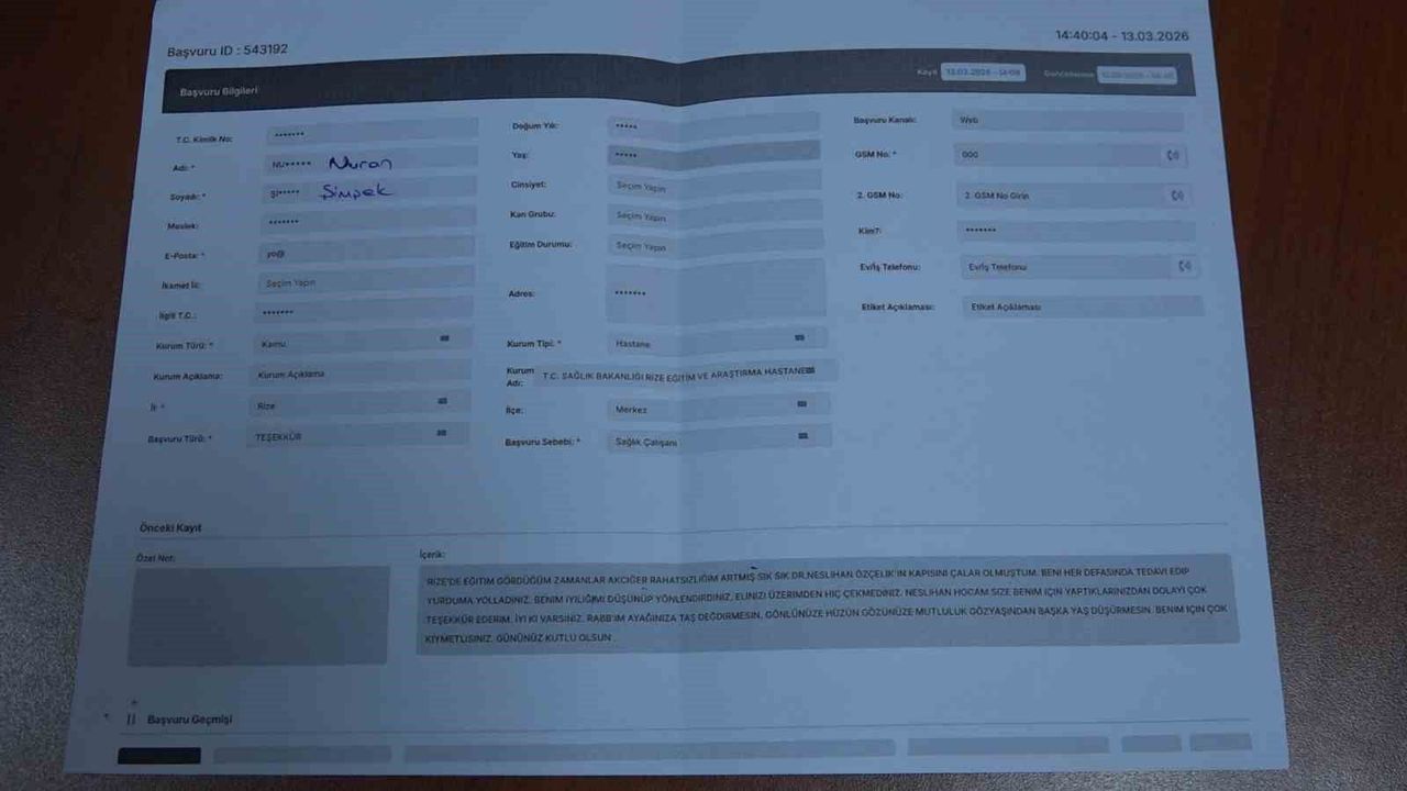 Rize'de öğrenim gördüğü sırada rahatsızlanarak akciğer yetmezliği olduğunu öğrenen 21 yaşındaki genç kız, tedavi sürecinde kendisiyle ilgilenen doktoruna minnettarlığını daha çok şikayet ve talepler için kullanılan CİMER üzerinden teşekkür mesajı yazarak iletti.