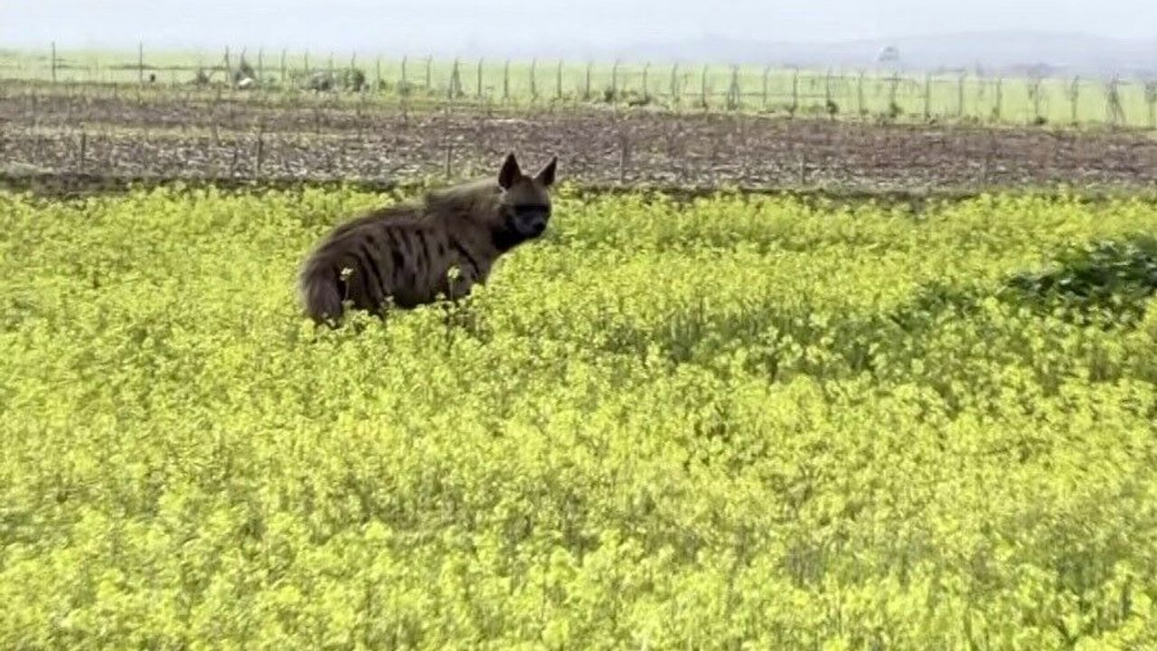 Adıyaman'ın Besni ilçesinde çizgili sırtlan sarı çiçeklerle kaplı tarlada yürürken görüntülendi.