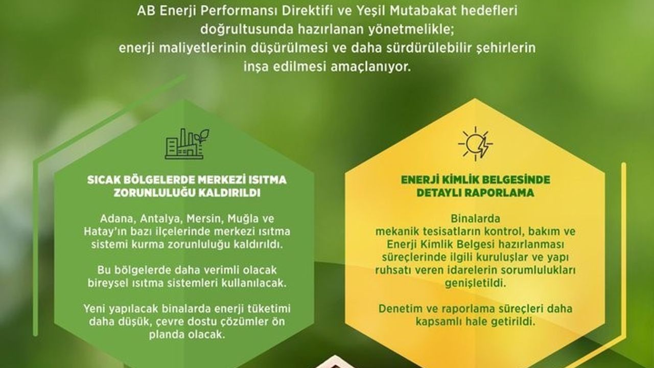 Binalarda mekanik tesisatların kontrol, bakım ve enerji kimlik belgesi hazırlanması süreçlerinde yetki ve sorumluluklar yeniden düzenlendiği belirtilen açıklamada, Denetim ve raporlama süreçleri daha kapsamlı hale getirildi. Ayrıca, enerji kimlik belgesi düzenleyen kuruluşlar ve yapı ruhsatı veren idarelerin sorumlulukları genişletildi. Yeni yönetmelik ile birlikte Türkiye, sürdürülebilir ve iklim dostu yapılaşma yolunda önemli bir adım daha atmış oldu" açıklamasında bulunuldu.