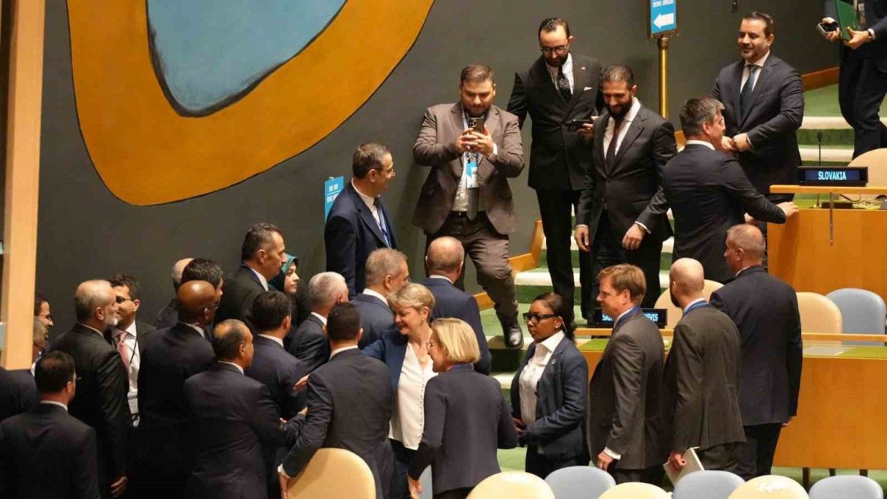 Cumhurbaşkanı Recep Tayyip Erdoğan, Filistin Meselesine Çözüm Bulunması ve İki Devletli Çözümün Hayata Geçirilmesi Konulu Yüksek Düzeyli Uluslararası Konferansı’na katılmak üzere geldiği Birleşmiş Milletler (BM) binasında Suriye Devlet Başkanı Ahmed eş-Şara ile sohbet etti.