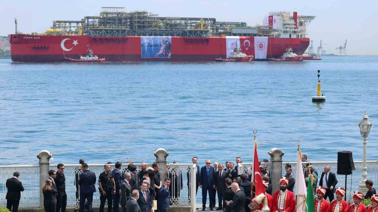 Cumhurbaşkanı Recep Tayyip Erdoğan, Dolmabahçe Sarayı’ndan yüzer doğalgaz üretim platformu "Osman Gazi", İstanbul’un fethinin 572. yıl dönümünde Karadeniz’e gidişini uğurladı.