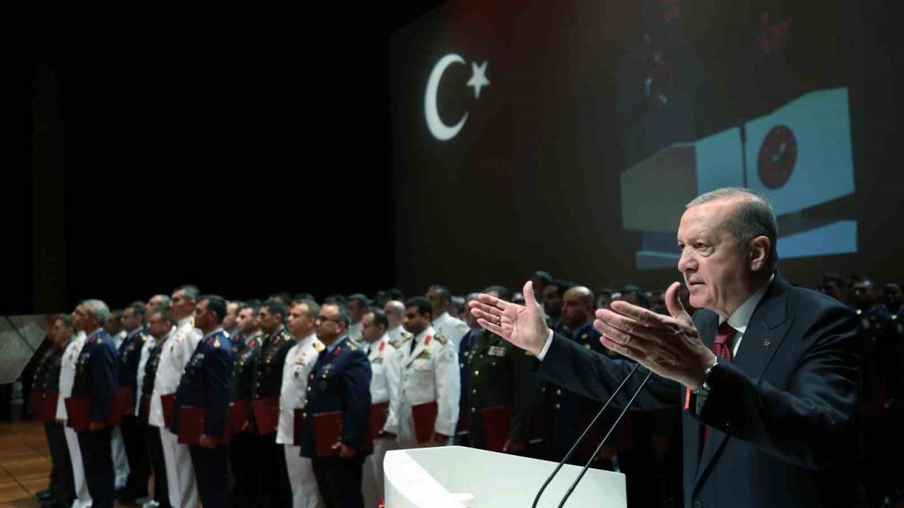 Büyük ve güçlü Türkiye’yi inşa etmenin en temel vazifeleri olduğunu vurgulayan Cumhurbaşkanı Erdoğan, "Farklı kıtalara nizam veren idari ve siyasi teşkilatlanma kabiliyetimizi askeri taktik ve stratejilerimizle besledik, zenginleştirdik. İlk düzenli ve disiplinli ordumuzu bundan tam 2 bin 234 yıl evvel, milattan önce 209’da kurduk. Modern ordularla uygulanan onlu sistemi dünya askeri literatürüne 2 bin yıl önce biz hediye ettik. Alplerimizle, erenlerimizle, gazilerimizle fetih ve gaza ruhunu gönül coğrafyamızın dört bir yanına yayarken, istimalet anlayışımızla aynı zamanda kalpleri de fethettik. Bugün sert ve yumuşak gücün mükemmel terkibini ifade eden akil güç, ecdadımız tarafından istimalet politikası olarak yıllarca uygulandı. Sultan Fatih’in liderliğinde 1453’te topları etkin bir şekilde kullanarak yalnızca İstanbul’u fethetmekle kalmadık, aynı zamanda savaş konseptini de baştan aşağı değiştirdik. Lojistik yapılanmadan, sefer planlamasına, haritacılıktan, haber alma operasyonlarına, harp sahasına yeni bir ufuk kazandırdık. Muharip unsurların sevk ve idaresinde, taktik ve manevra kabiliyetinin geliştirilmesinde dünyada eşi benzeri olmayan yeniliklere imza attık. Değerli arkadaşlarım, bakınız şu örneği özellikle sizlerle paylaşmak istiyorum. Hadimü’l-Haremeyni’ş-Şerifeyn Yavuz Sultan Selim Han, Mısır Seferi sırasında ‘geçilmez’ denilen Sina Çölü’nü sadece 13 günde geçti. Kendisinden üç asır sonra Napolyon ordularının dahi geçemediği bu çölü üstün bir askeri zekayla tasarladığı ikmal ve su tedarik sistemiyle neredeyse hiçbir zayiat vermeden aşmayı başarmıştır. Aynı şekilde, Malazgirt Savaşı’nda Sultan Alparslan, Türk askeri dehasının bir başka örneği olan hilal taktiğini son derece başarılı bir şekilde uygulayarak Anadolu’nun kapılarını ardına kadar açmıştır. Hayat ve haysiyetimiz için çarpıştığımız, yedi düvele meydan okuduğumuz İstiklal Mücadelesi de hiç şüphesiz milletimizin iman ve cesaretinin yanı sıra, subaylarımızın feraset ve dehasıyla zafere ulaşmıştır. Bu zaferlerden biri de 26 Ağustos 1922’de Gazi Mustafa Kemal’in Büyük Taarruz’la başlayan ve 30 Ağustos’ta Başkomutan Meydan Muharebesi ile taçlanan harekatıdır. Subaylarımızı ‘ordunun ruhu’ olarak tanımlayan Gazi Mustafa Kemal bu harekata ilişkin şu değerlendirmeyi yapmıştır; ‘Her safhasıyla düşünülmüş, hazırlanmış, idare edilmiş ve zaferle sonuçlandırılmış olan bu harekat, Türk ordusunun, Türk subay ve komuta heyetinin yüksek kudret ve kahramanlığını tarihe bir kere daha geçiren muazzam bir eserdir’. Her sayfasını zaferle, erdemle, hakkaniyetle süslediğimiz köklü tarihimiz askeri deha ve kabiliyet anlamında daha nice başarılarla doludur. Şehit ve gazilerimizden emanet aldığımız bu toprakları çok daha güçlü bir şekilde geleceğe taşımak, büyük ve güçlü Türkiye’yi inşa etmek bizim en temel vazifemizdir. Çalışmalarımızı şanlı mazimizden aldığımız güç ve cesaretle, milletimize duyduğumuz sarsılmaz güvenle, işte bu istikamette sürdürüyoruz" diye konuştu.