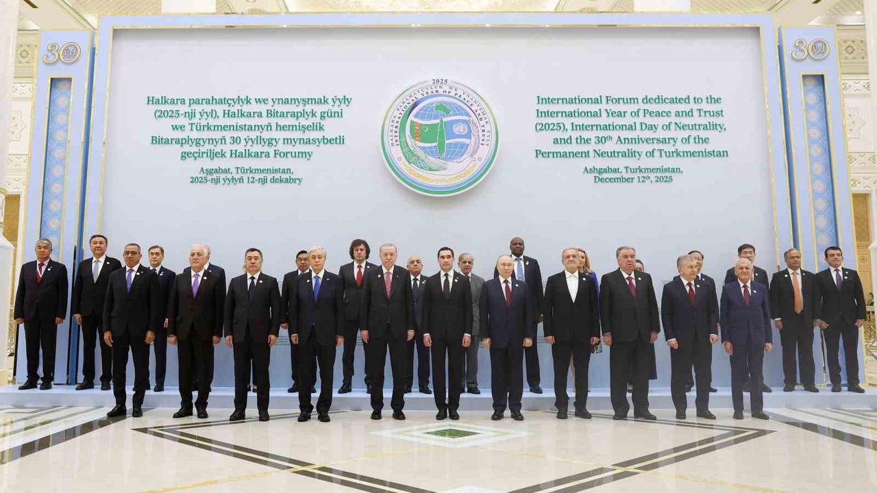 Cumhurbaşkanı Recep Tayyip Erdoğan, Uluslararası Barış ve Güven Forumu'na katılmak üzere geldiği dün akşam saatlerinde geldiği Türkmenistan'ın başkenti Aşkabat'ta temaslarına başladı. Cumhurbaşkanı Erdoğan, davetli devlet ve hükûmet başkanlarıyla birlikte Tarafsızlık Anıtı'na çelenk koyma törenine katıldı. Cumhurbaşkanı Erdoğan, çelenk koyma töreninin ardından 'Uluslararası Barış ve Güven Forumu öncesinde, forumun yapıldığı Türkmenistan Maslahatlar Merkezi'ne geçti. Burada Türkmenistan Devlet Başkanı Serdar Berdimuhamedov tarafından karşılanan Cumhurbaşkanı Erdoğan, Berdimuhamedov ile tokalaşarak fotoğraf çektirdi. Karşılama töreninin ardından aile fotoğrafı çekimine geçildi. Aile fotoğrafı çekiminde Cumhurbaşkanı Erdoğan'ın sağında Kazakistan Cumhurbaşkanı Kasım Cömert Tokayev ve solunda ise Türkmenistan Devlet Başkanı Serdar Berdimuhamedov yer aldı.