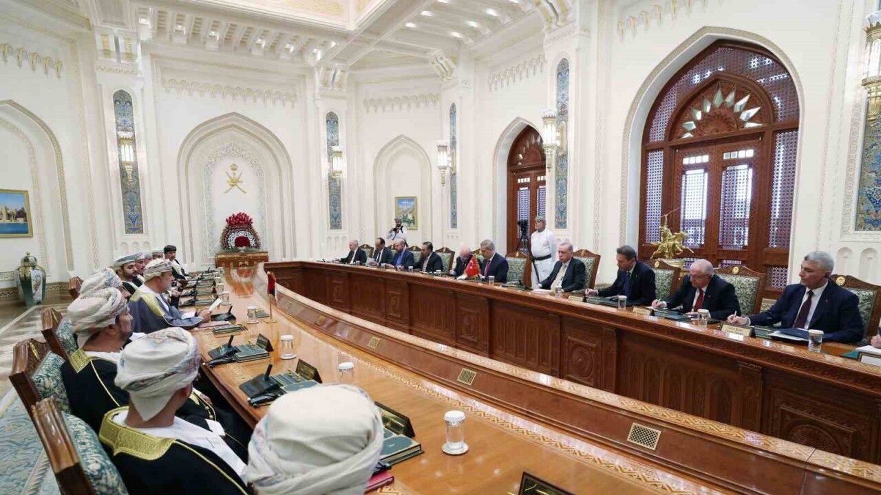 Cumhurbaşkanı Recep Tayyip Erdoğan, Körfez turunun son durağı olan Umman’da temaslarını sürdürüyor. Erdoğan, Umman Sultanı Heysem bin Tarık bin Teymur El Said ile heyetlerarası toplantıya başkanlık etti. Al Alam Sarayı’ndaki toplantıya Dışişleri Bakanı Hakan Fidan, Enerji ve Tabii Kaynaklar Bakanı Alparslan Bayraktar, Milli Savunma Bakanı Yaşar Güler, Sanayi ve Teknoloji Bakanı Mehmet Fatih Kacır, Ticaret Bakanı Ömer Bolat, Hazine ve Maliye Bakanı Mehmet Şimşek, Cumhurbaşkanı Dış Politika ve Güvenlik Başdanışmanı Akif Çağatay Kılıç, Millî İstihbarat Teşkilatı (MİT) Başkanı İbrahim Kalın ve Cumhurbaşkanlığı Özel Kalem Müdürü Hasan Doğan katıldı.