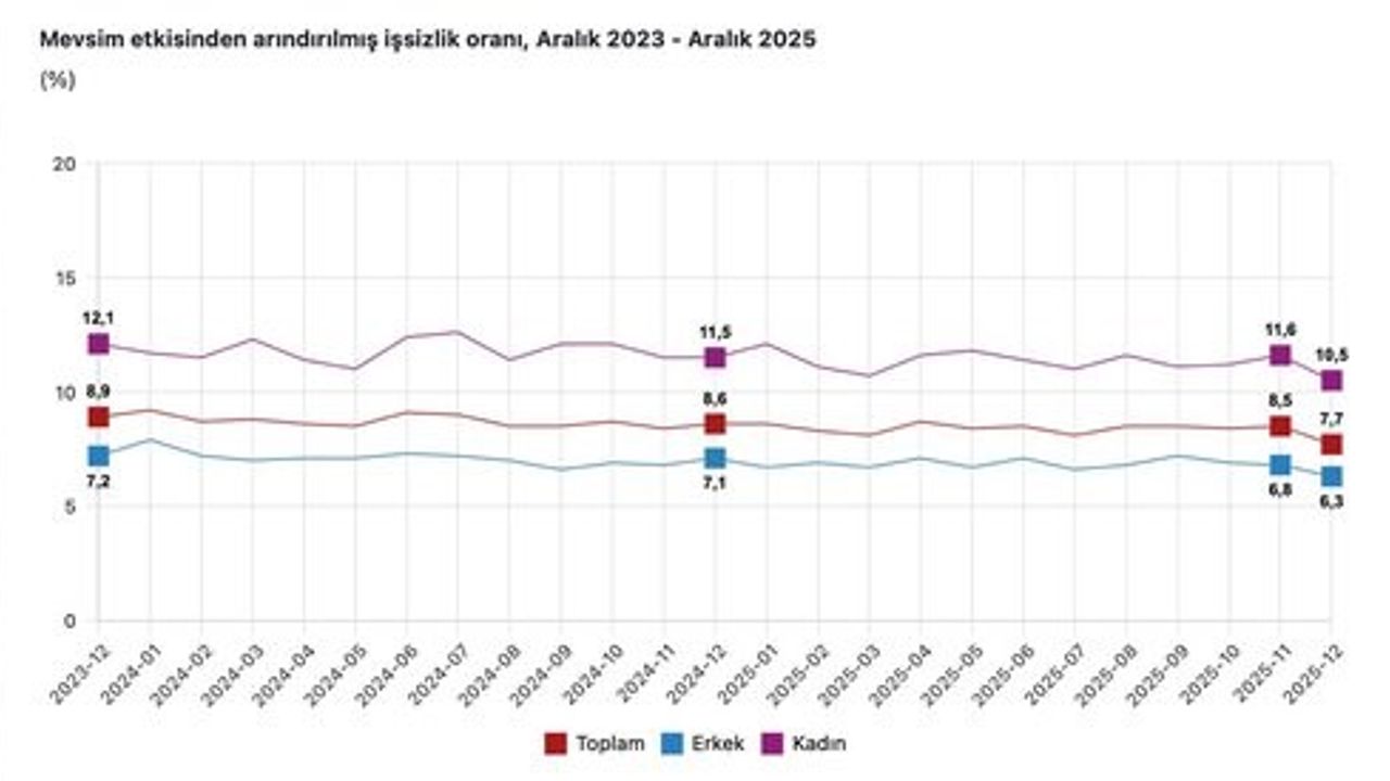 Aralık ayındaki verilere göre işsizlik oranının yüzde 7,7 olarak açıklandığını ifade eden Yılmaz, istihdam verilerinin, işgücü istatistik verilerinin açıklanmaya başlandığı 2005 yılından bu yana en düşük seviyeye indiğinin altını çizdi. Yılmaz ayrıca, işsizliğin gençlerde geçen senenin aynı ayına göre 1,9 puan, kadınlarda ise 1 puan iyileşerek sırasıyla yüzde 14,1 ve yüzde 10,5 olduğunu sözlerine ekledi.