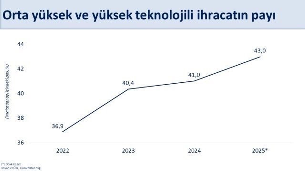 Bakan Şimşek ise yaptığı paylaşımda, 'Kasım ayında ihracat yıllık 270,6 milyar dolara ulaşırken, ithalat küresel altın fiyatlarındaki artışın da etkisiyle 361,9 milyar dolar gerçekleşti. İhracatımızın teknoloji kompozisyonu iyileşti. Ocak-kasım döneminde yüksek ve orta-yüksek teknolojili ürün ihracatı yıllık yüzde 9,6 arttı. Bu grupların imalat sanayi ihracatındaki payı yüzde 43'e yükseldi. Yüksek teknolojili üretimi ve rekabet gücümüzü artırmak hedefiyle aktif sanayi politikalarımızı uygulamaya devam ediyor, üretken sektörlere yönelik desteklerimizi daha da güçlendiriyoruz' dedi.