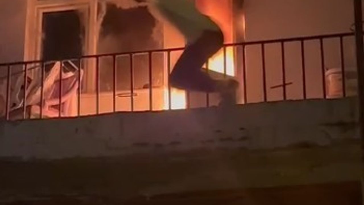 Kocaeli’nin İzmit ilçesinde 5 katlı binanın 1’inci katındaki daire alevlere teslim oldu. Yardım için daireye giren gencin balkondan atladığı anlar, anbean cep telefonu kamerasına yansıdı.