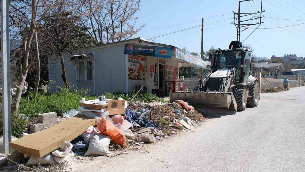 Defne Belediyesi ekipleri, temiz çevre anlayışıyla ilçe genelindeki hafriyat atıklarını iş makinasıyla topluyor.