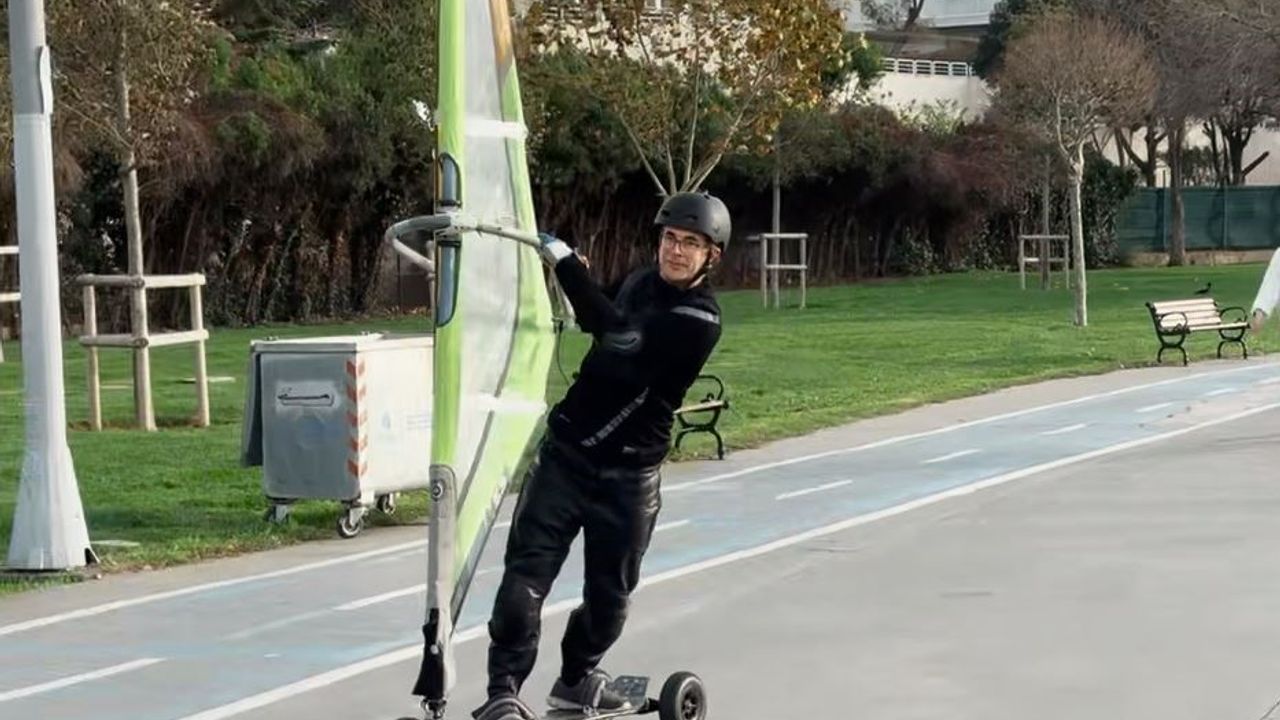 Bakırköy’de bir sörf tutkunu, lodosu fırsata çevirdi. Kaykaya monte ettiği yelkenle karada sörf yapan genç, kameralara yansıdı.