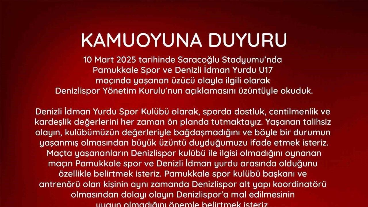 Denizli İdman Yurdu Spor Kulübü As Başkanı Aykut Akçagül tarafından yapılan açıklamada; "10 Mart 2025 tarihinde Saraçoğlu Stadyumunda Pamukkale Spor ve Denizli İdman Yurdu U17 maçında yaşanan üzücü olayla ilgili olarak Denizlispor yönetim kurulunun açıklamasını üzüntüyle okuduk. Denizli İdman Yurdu Spor Kulübü olarak sporda dostluk centilmenlik ve kardeşlik değerlerini her zaman ön planda tutmaktayız. Yaşanan talihsiz olayın Kulübümüzün değerleri ile uyuşmadığını ve böyle bir durumun yaşanmış olmasından büyük üzüntü duyduğumuzu ifade etmek isteriz. Maçta yaşananların, Denizlispor Kulübü ile ilgisi olmadığını, oynanan maçın Pamukkale Spor ve Denizli idman Yurdu arasında olduğunu özellikle belirtmek isteriz. Pamukkale Spor Kulübü Başkanı ve antrenörü olan kişinin aynı zamanda Denizlispor Altyapı Koordinatörü olmasından dolayı olayın Denizlispor’a mal edilmesinin uygun olmadığını önemle belirtmek isteriz. Maç sonunda yaşanan olayla ilgili olarak kulüp yönetimi tarafından gerekli incelemeler başlatılmıştır. Her zaman dile getirdiğimiz gibi, iki kardeş kulüp arasındaki ilişkilerin zarar görmesini istemediğimizi ve sporun birleştirici gücüne inandığımızı önemle belirtiriz" ifadeleri kullanıldı.