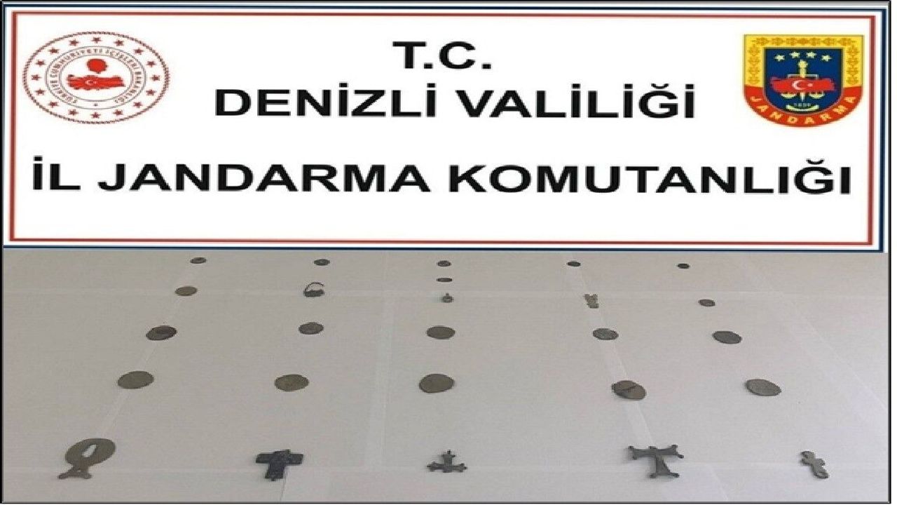Denizli İl Jandarma Komutanlığı ekiplerince yapılan çalışmalarda, bir şüpheli şahsa yönelik yapılan arama çalışmasında üzerinden 4 adet Bizans ve Selçuklu dönemine ait haç, 18 sikke ve 4 adet obje çıktı.