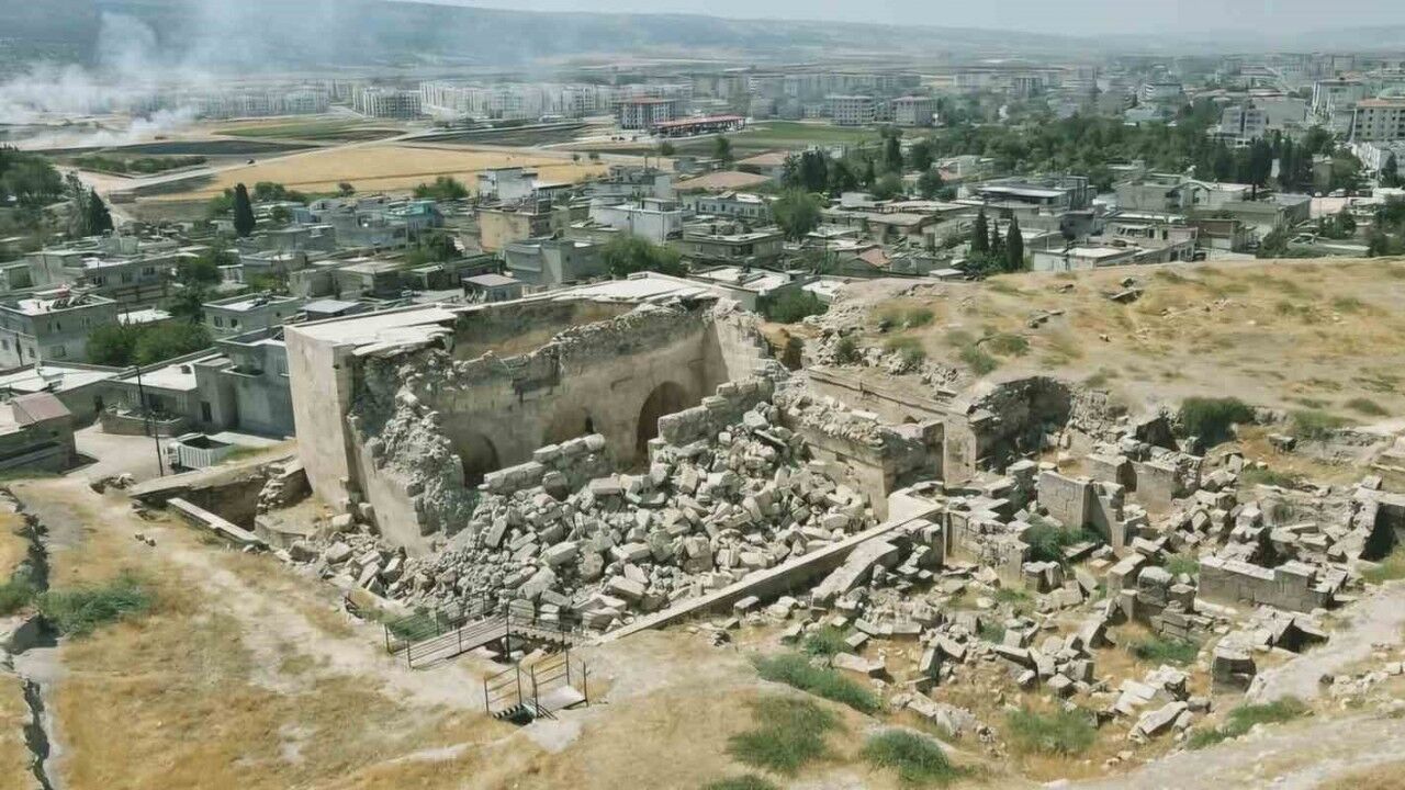 Kahramanmaraş merkezli depremlerden etkilenerek ön cephesi çöken Gaziantep’in Araban ilçesindeki tarihi Raban Kale-i Zerrin Kalesi üzerinde bulunan İç Kale Cami onarılmayı bekliyor.