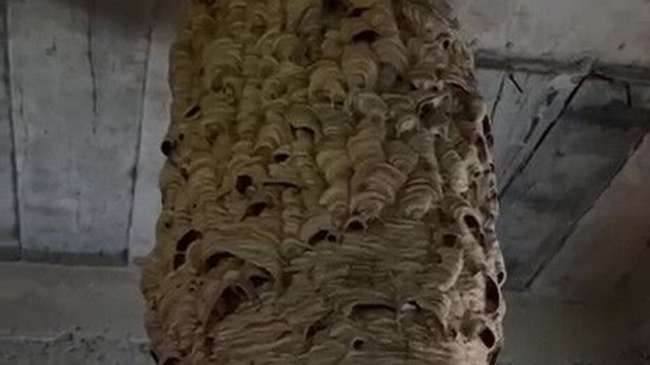 İlçenin Fırtına Mahallesi’nde yaban arısı yoğunluğundan rahatsız olan mahalle sakinleri, yakında bulunan metruk evi kontrol etmek istedi. Metruk evin içerisine giren mahalle sakinleri, tavandan aşağıya asılı olan arı yuvasını görünce şaşkına döndü. 75 santimi aşan uzunluğu ile tavandan sarkan yuvayı testere ile kesen mahalle sakinleri bölgeden uzaklaştırdı.