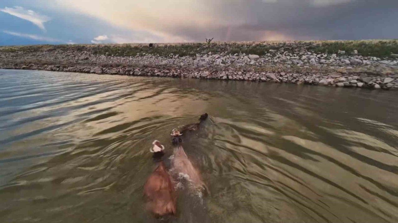 Diyarbakır Devegeçidi Barajında kaydedilen görüntüler izleyenleri hem şaşırttı hem gülümsetti. Sıcak havadan bunalan üç büyükbaş hayvanın baraj göletinde serinlediği anlar, dron kamerasına yansıdı. Aynı bölgede otlayan koyun sürüsü de deponun sesi ve hareketinden ürkerek panikle kaçmaya başladı. Koyunların telaşla dağılması renkli ve ilginç görüntüler ortaya çıkardı.