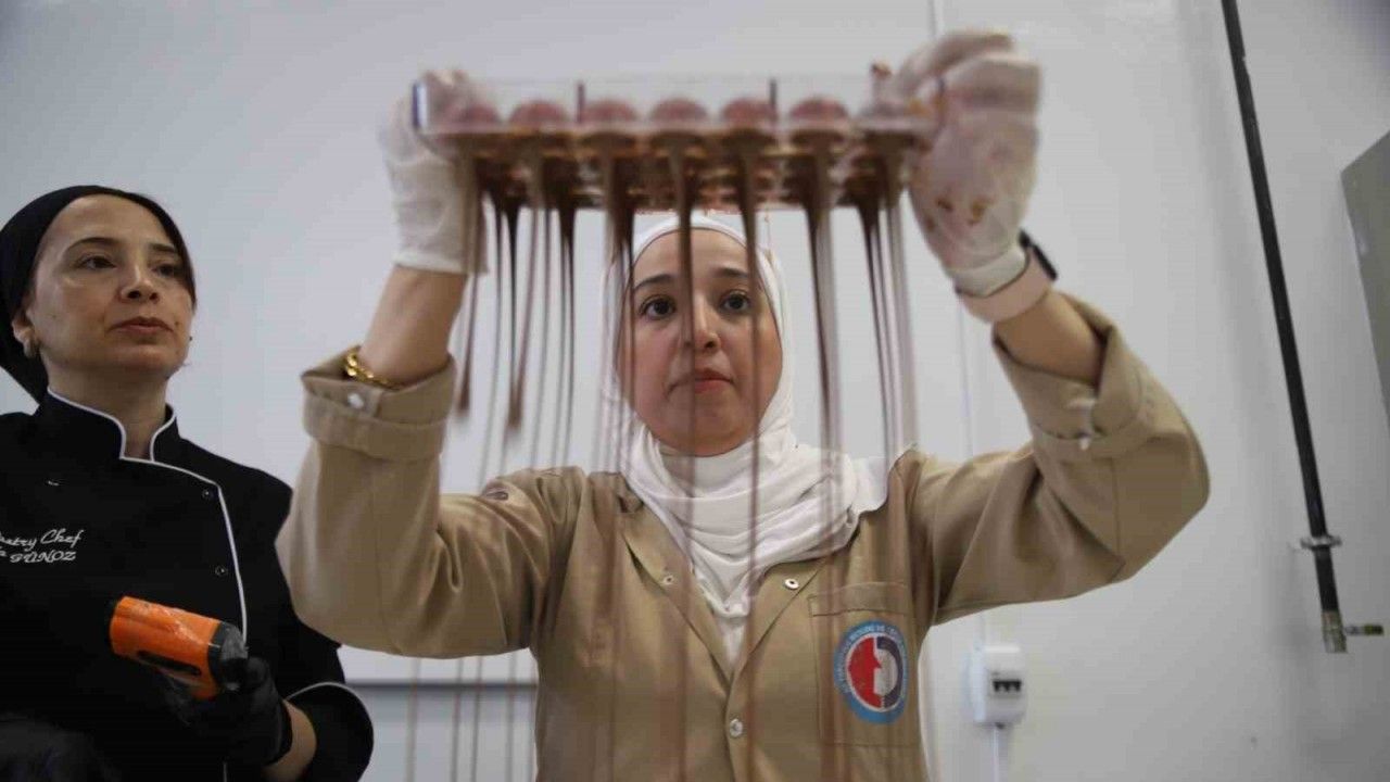 Kursta bir birinden lezzetli ve çeşit çeşit çikolata yapmayı öğrenen kadınlara, katma değeri yüksek çikolata üretiminin yaygınlaştırılması amacıyla eğitim veriliyor.