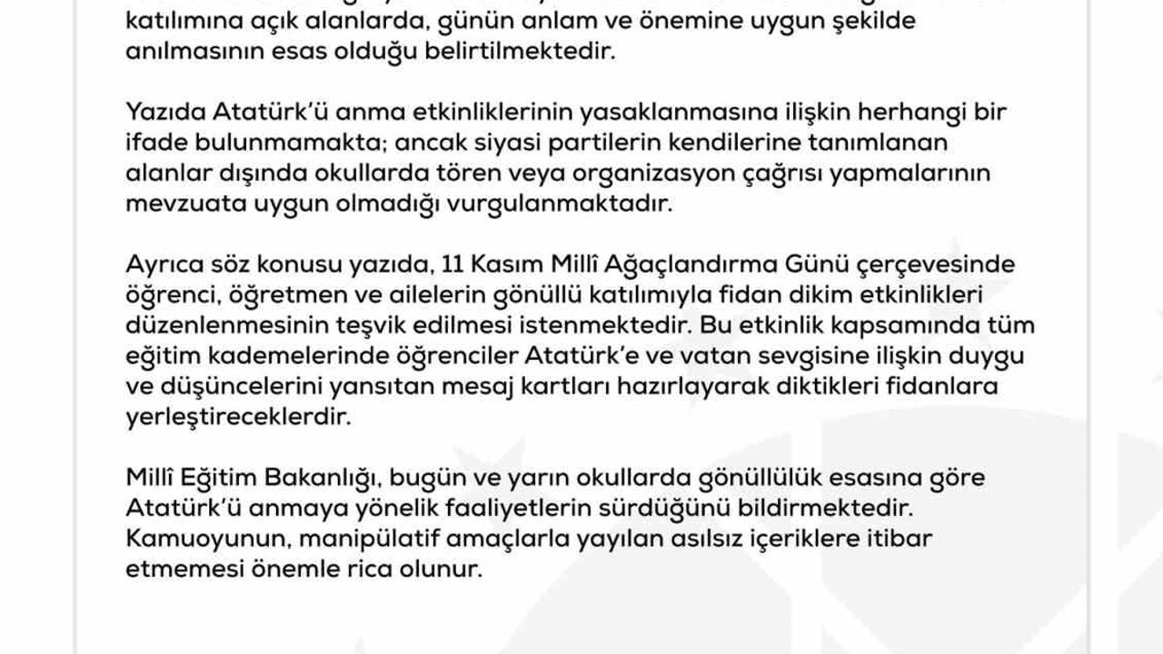 "Çeşitli basın organlarında ve sosyal medya mecralarında, "Milli Eğitim Bakanlığı’nın 10 Kasım’da okullarda Atatürk’ü anmayı yasakladığı ve ‘kapıları kilitleyin’ talimatı verdiği’ şeklinde yer alan iddialar dezenformasyon içermektedir. Milli Eğitim Bakanlığı’nın 8 Kasım tarihli yazısında, 10 Kasım Atatürk’ü Anma Günü’nün ilgili yönetmelik uyarınca valiliklerin belirlediği ve herkesin katılımına açık alanlarda, günün anlam ve önemine uygun şekilde anılmasının esas olduğu belirtilmektedir. Yazıda Atatürk’ü anma etkinliklerinin yasaklanmasına ilişkin herhangi bir ifade bulunmamakta; ancak siyasi partilerin kendilerine tanımlanan alanlar dışında okullarda tören veya organizasyon çağrısı yapmalarının mevzuata uygun olmadığı vurgulanmaktadır. Ayrıca söz konusu yazıda, 11 Kasım Milli Ağaçlandırma Günü çerçevesinde öğrenci, öğretmen ve ailelerin gönüllü katılımıyla fidan dikim etkinlikleri düzenlenmesinin teşvik edilmesi istenmektedir. Bu etkinlik kapsamında tüm eğitim kademelerinde öğrenciler Atatürk’e ve vatan sevgisine ilişkin duygu ve düşüncelerini yansıtan mesaj kartları hazırlayarak diktikleri fidanlara yerleştireceklerdir. Milli Eğitim Bakanlığı, bugün ve yarın okullarda gönüllülük esasına göre Atatürk’ü anmaya yönelik faaliyetlerin sürdüğünü bildirmektedir. Kamuoyunun, manipülatif amaçlarla yayılan asılsız içeriklere itibar etmemesi önemle rica olunur."