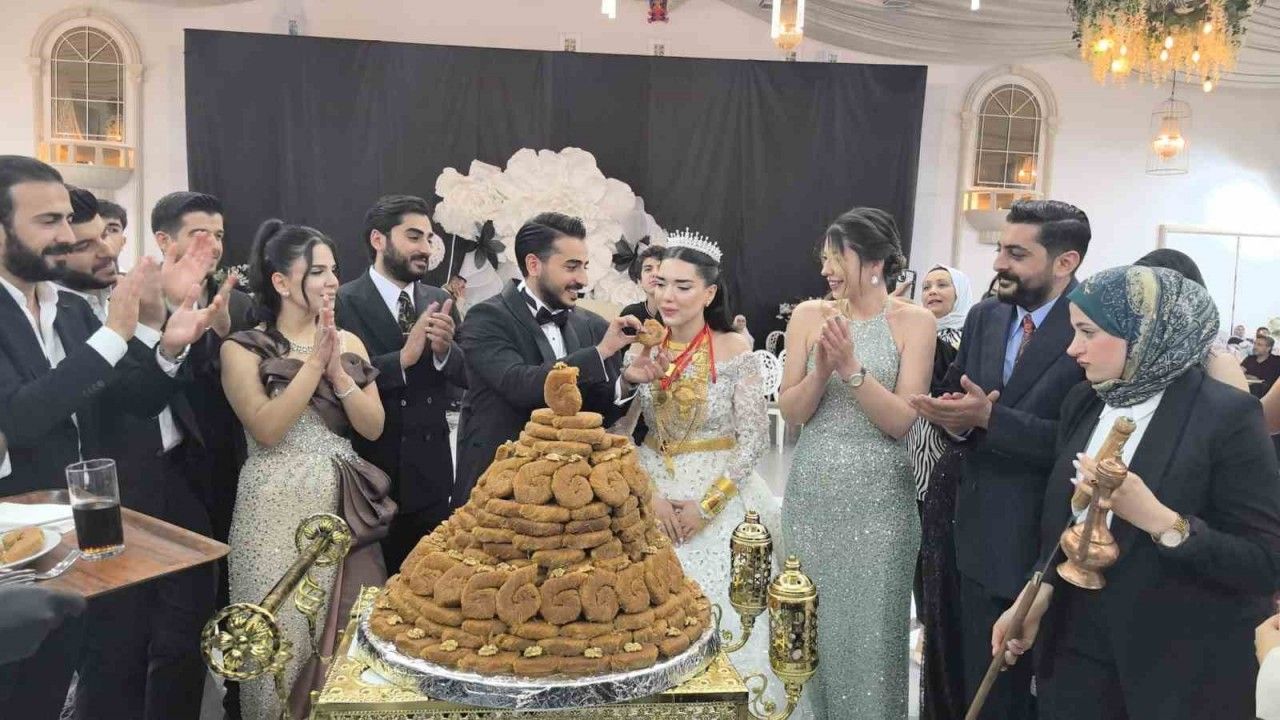 Nikahın ardından genç çift, düğün pastalarını klasik düğün pastası yerine, 21 kattan oluşan kentin geleneksel, tescilli tatlısı burma kadayıf tercih etti.