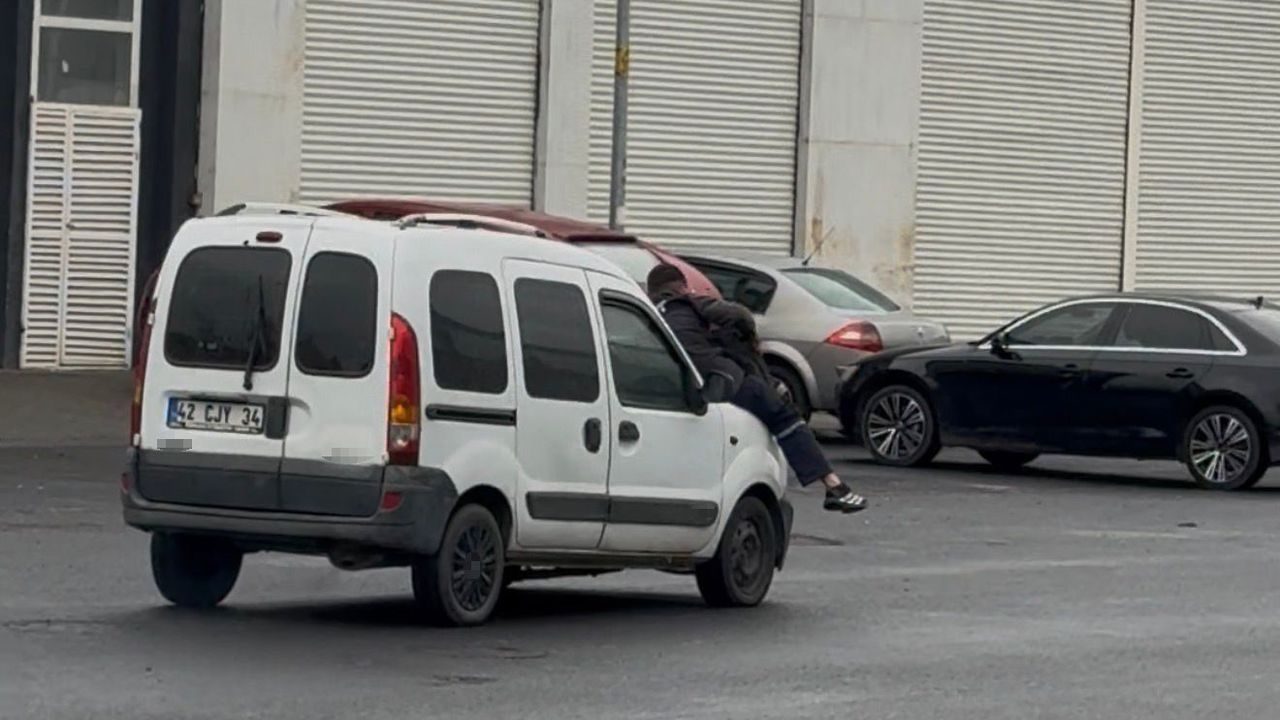 Diyarbakır sanayisinde bir usta, otomobilden gelen sesi anlamak için aracın kaputunun üstüne oturarak tur attı. O anlar görenleri gülümsetti.
