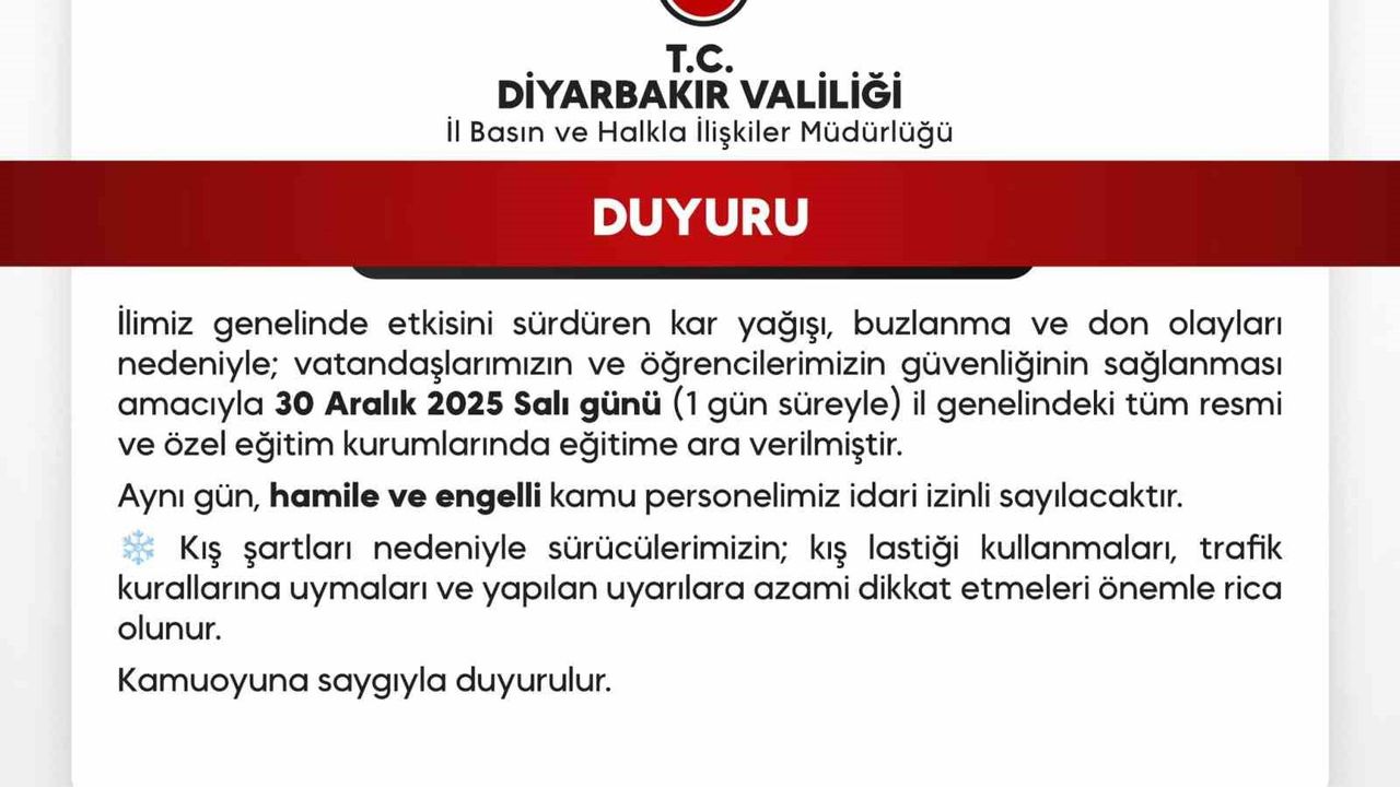 Diyarbakır Valiliğinden yapılan açıklamada, 'İlimiz genelinde etkisini sürdüren kar yağışı, buzlanma ve don olayları nedeniyle; vatandaşlarımızın ve öğrencilerimizin güvenliğinin sağlanması amacıyla 30 Aralık 2025 Salı günü 1 gün süreyle il genelindeki tüm resmi ve özel eğitim kurumlarında eğitime ara verilmiştir. Aynı gün, hamile ve engelli kamu personelimiz idari izinli sayılacaktır' denildi.