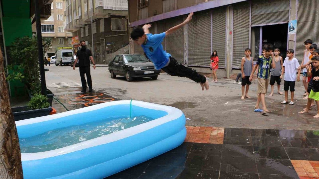 Merkez Bağlar ilçesi Selahattin Eyyubi Caddesi’nde araç jant işi yapan 36 yaşındaki Ercan Alkın, çocuklar için örnek bir davranışa imza attı. Alkın, iş yerinin önüne kurduğu şişme plastik havuzun içini suyla doldurup çocukların serinlemesini sağlıyor. Sıcaktan bunalan çocuklar, gün boyu bu küçük havuzda vakit geçirerek hem eğleniyor hem de serinliyor.