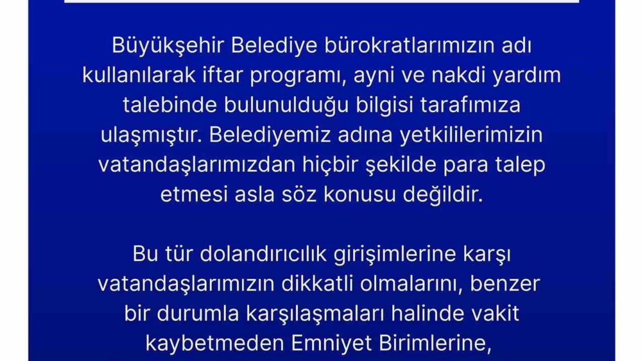 Erzurum Büyükşehir Belediyesi tarafından konu ile ilgili yapılan açıklamada şöyle denildi, ' Büyükşehir Belediye bürokratlarımızın adı kullanılarak iftar programı, ayni ve nakdi yardım talebinde bulunulduğu bilgisi tarafımıza ulaşmıştır. Belediyemiz adına yetkililerimizin vatandaşlarımızdan hiçbir şekilde para talep etmesi asla söz konusu değildir.Bu tür dolandırıcılık girişimlerine karşı vatandaşlarımızın dikkatli olmalarını, benzer bir durumla karşılaşmaları halinde vakit kaybetmeden Emniyet Birimlerine, Cumhuriyet Başsavcılığı'na veya doğrudan Belediyemize bilgi vermelerini önemle rica ederiz'