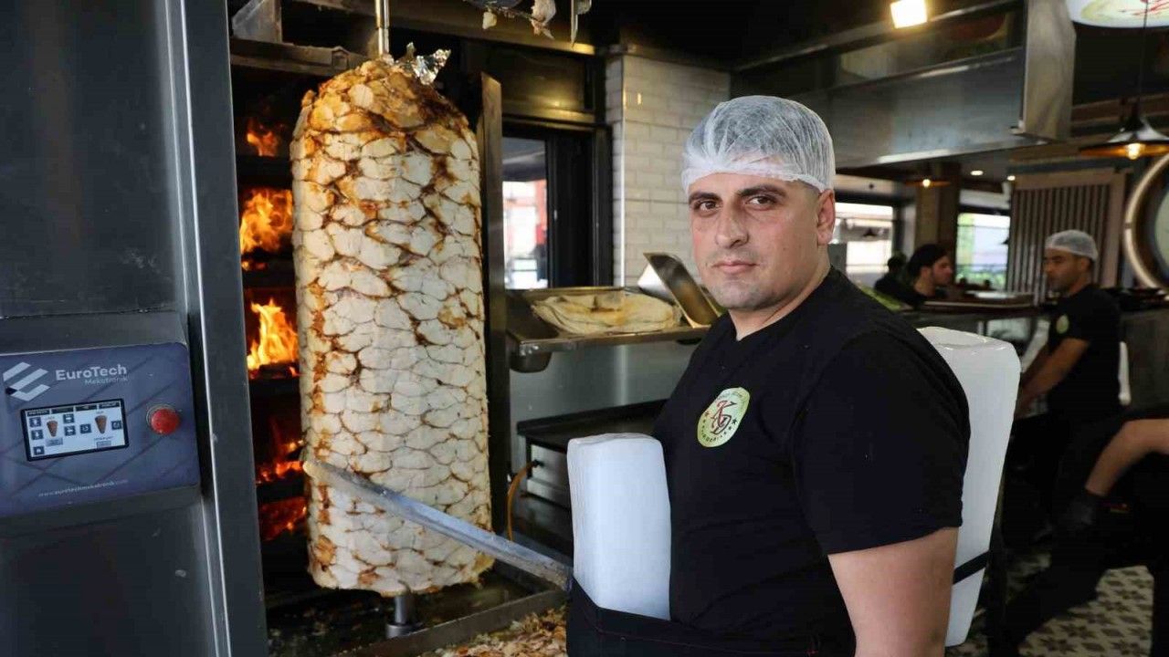 Adana’da hava sıcaklıkları 40 dereceyi aşınca ocak başında çalışan döner ustaları, sırt ve göğüslerine kalıp buz koyarak çalışmaya başladı.