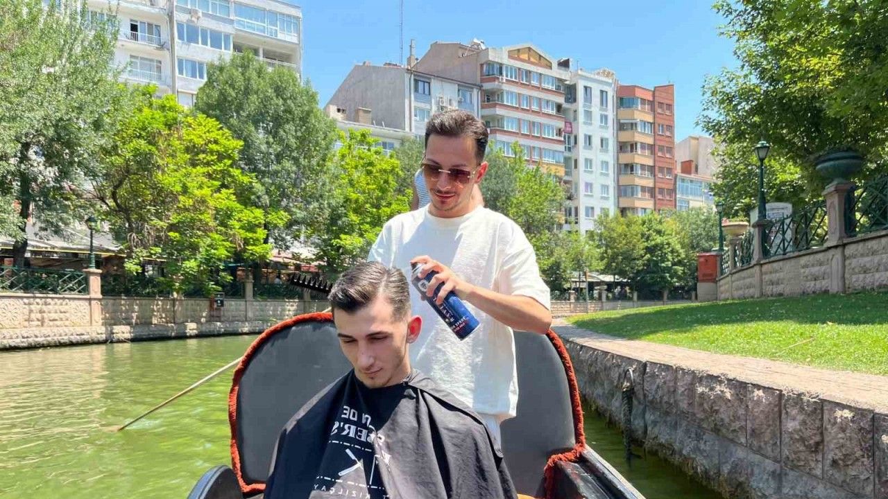 Eskişehir’de 14 yıldır erkek kuaförlüğü yapan Mehmet Düşünceler, genellikle turistlerin tercih ettiği Porsuk Çayı üzerinde yüzen gondolda müşterisinin saçını şekillendirdi. O anların videosu sosyal medyada onlarca yorum ve beğeni aldı.