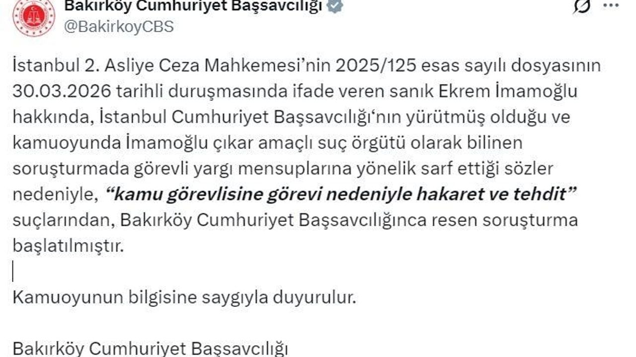 Bakırköy Cumhuriyet Başsavcılığı tarafından yapılan açıklamada, ' İstanbul İstanbul 2. Asliye Ceza Mahkemesi'nin 2025/125 esas sayılı dosyasının 30.03.2026 tarihli duruşmasında ifade veren sanık Ekrem İmamoğlu hakkında, İstanbul Cumhuriyet Başsavcılığı'nın yürütmüş olduğu ve kamuoyunda İmamoğlu çıkar amaçlı suç örgütü olarak bilinen soruşturmada görevli yargı mensuplarına yönelik sarf ettiği sözler nedeniyle , 'kamu görevlisine görevi nedeniyle hakaret ve tehdit' suçlarından, Bakırköy Cumhuriyet Başsavcılığınca resen soruşturma başlatılmıştır.