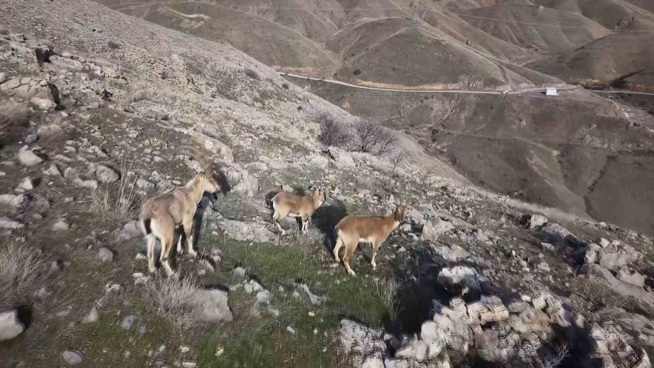 Nesli tükenme tehdidi altında bulunan ve avlanması yasaklanan dağ keçileri, Elazığ'ın farklı noktalarında görülmeye devam ediyor. Keban Fırat Kültür Spor Kulübü Başkanı Fethi Oruç, Kurşunkaya köyü kırsalında doğa yürüyüşü yaptığı ve sporcularına eğitim verdiği sırada sürü halindeki dağ keçilerini gördü. Oruç, doğada otlanan keçileri dron ile görüntüledi. Dağ keçileri bir süre sonra gözden kayboldu.