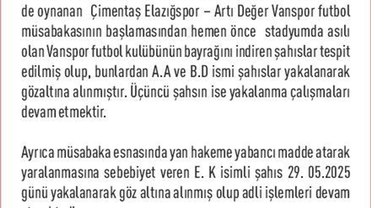 Elazığ Valiliğinden yapılan açıklamada, 26 Mayıs’ta Elazığ Atatürk Stadyumu’nda saat 20.00’de oynanan Çimentaş Elazığspor-Artı Değer Vanspor futbol müsabakasının başlamasından hemen önce stadyumda asil olan Vanspor futbol kulübünün bayrağını indiren şahısların tespit edildiği belirtildi. Açıklamada, ’’Şahıslardan A.A. ve B.D. yakalanarak gözaltına alınmıştır. Üçüncü şahsın ise yakalanma çalışmaları devam etmektedir. Ayrıca müsabaka esnasında yan hakeme yabancı madde atarak yaralanmasına sebebiyet veren E.K. isimli şahıs 29 Mayıs’ta yakalanarak gözaltına alınmış olup, adli işlemleri devam etmektedir’’ denildi.