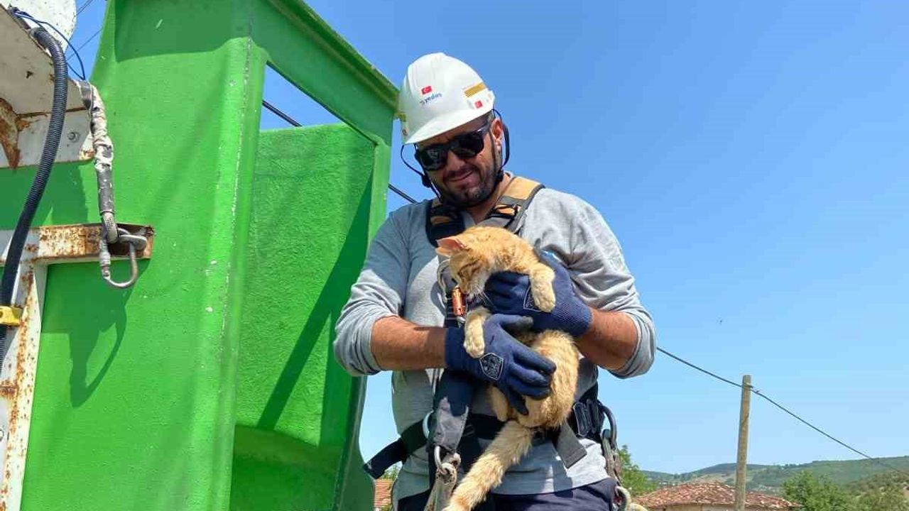 Amasya’nın Merzifon ilçesinde Kurban Bayramı’nın ilk günü elektrik direğine çıkan ve mahsur kalan kedi, elektrik firması ekiplerinin hızlı müdahalesiyle kurtarıldı.