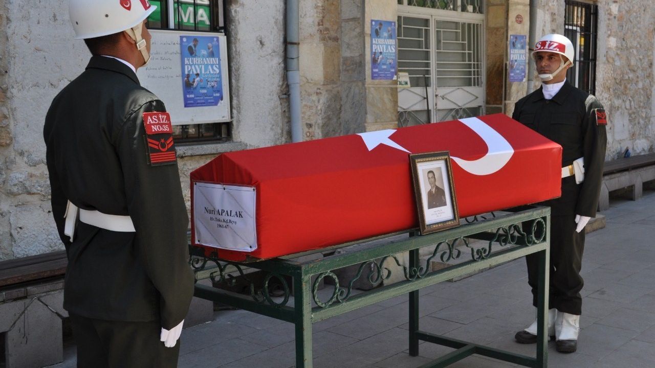 Cenaze töreni sonrası Eğirdir Dağ Komando Okulu yetkilileri, Nuri Apalak’ın eşi Mukaddes Apalak’a Türk bayrağını öperek teslim etti.