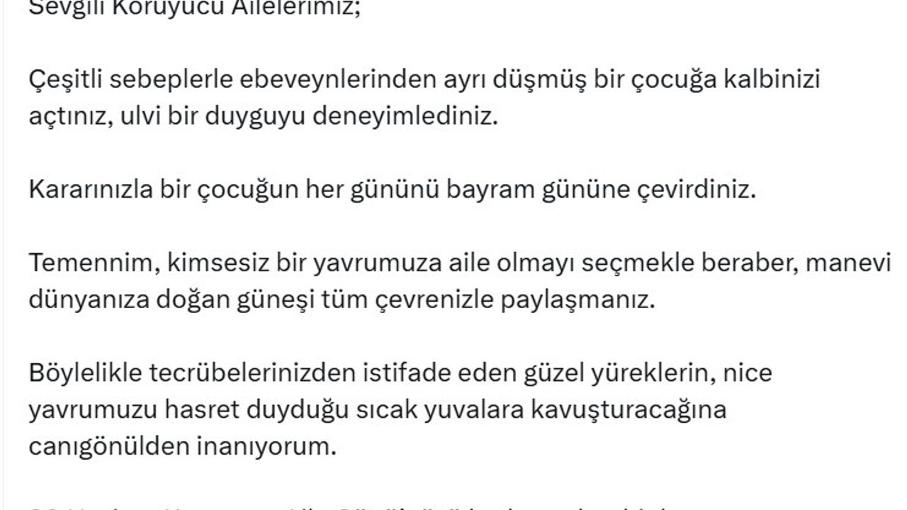 Emine Erdoğan, sosyal medya hesabından yaptığı paylaşımda, "Sevgili koruyucu ailelerimiz, çeşitli sebeplerle ebeveynlerinden ayrı düşmüş bir çocuğa kalbinizi açtınız, ulvi bir duyguyu deneyimlediniz. Kararınızla bir çocuğun her gününü bayram gününe çevirdiniz. Temennim, kimsesiz bir yavrumuza aile olmayı seçmekle beraber, manevi dünyanıza doğan güneşi tüm çevrenizle paylaşmanız. Böylelikle tecrübelerinizden istifade eden güzel yüreklerin nice yavrumuzu hasret duyduğu sıcak yuvalara kavuşturacağına canıgönülden inanıyorum. 30 Haziran Koruyucu Aile Günü’nüzü kutluyor, her bir koruyucu ebeveynimize ve 81 ilimizdeki gönül elçilerimize teşekkür ediyorum" dedi.
