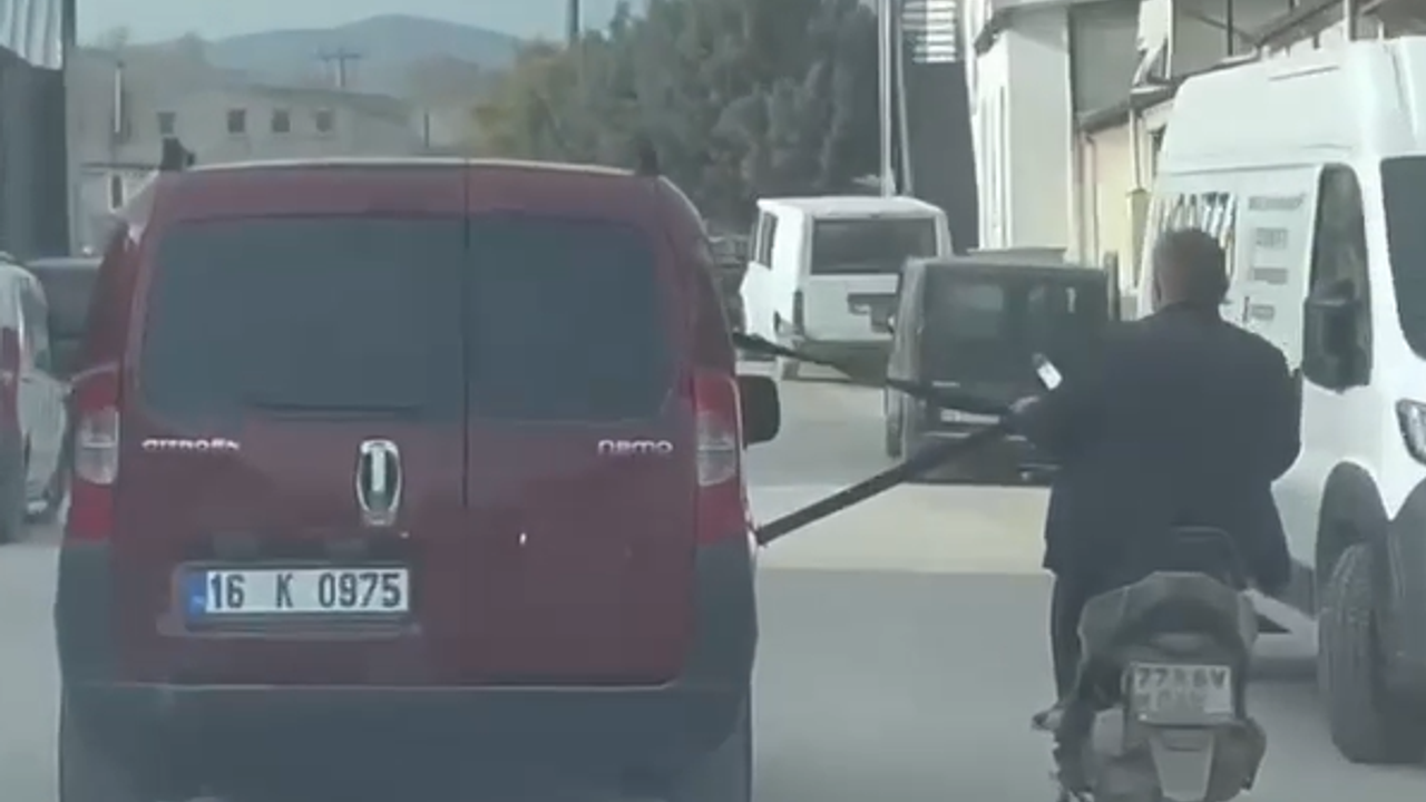 Kirazlı Sanayi Sitesi içindeki yolda bir motorun emniyet kemeriyle çekildiğini gören vatandaşlar gözlerine inanamadı. Bu anaları bir vatandaş cep telefonu kamerasıyla kaydetti. Görüntülerde motosiklet sürücüsü hafif ticari aracın yolcu koltuğunda uzatılan emniyet kemerini tuttuğu görülüyor.