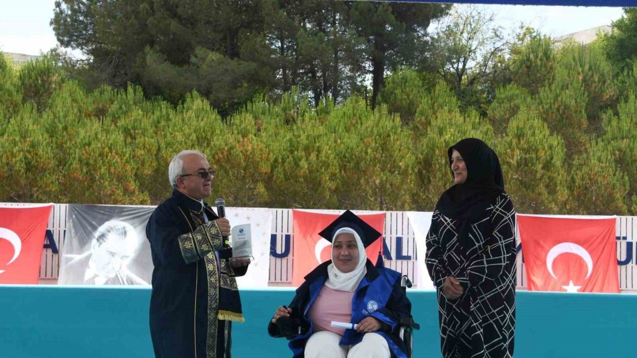 Bahadır, ALES’ten eşit ağırlık alanında 75 puan alarak akademik kariyer yolculuğu için de güçlü bir başlangıç yaptı. C1 düzeyindeki İngilizce sertifikası ve bilgisayar programları konusundaki yeterliliğiyle dikkat çeken Bahadır, hedeflerini yüksek tutarak geleceğe emin adımlarla ilerliyor. Şeymanur Bahadır’ın hikayesi; fiziksel engellerin, kararlılık ve çalışkanlık karşısında nasıl anlamını yitirdiğini, azmin ve istikrarın ise bireyin hayatını nasıl dönüştürebileceğini gösteren güçlü bir örnek niteliği taşıyor. Şeymanur Bahadır’ın mezuniyet töreninde, bu zorlu eğitim yolculuğunda her gün kendisine eşlik ederek en büyük destekçisi olan annesi Ayşe Bahadır’a da teşekkür plaketi takdim edildi. Dört yıl boyunca her an kızının yanında olan anne Bahadır, eğitim sürecinin görünmeyen kahramanı olarak takdir topladı.