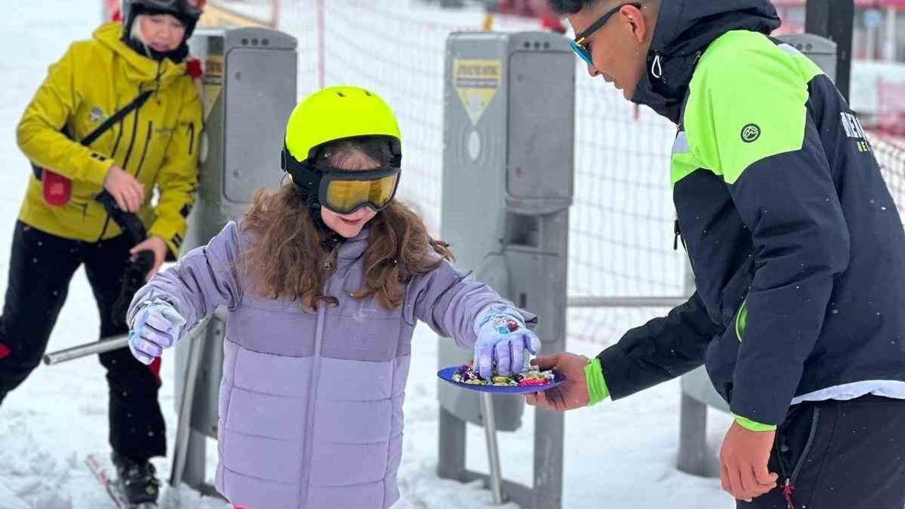 Erciyes Kayak Merkezi yöneticileri de bayram tatili için Erciyes'e gelen misafirlerine sürpriz yaparak pistler üzerinde bayramlarını kutladı ve şeker ikramında bulundu.