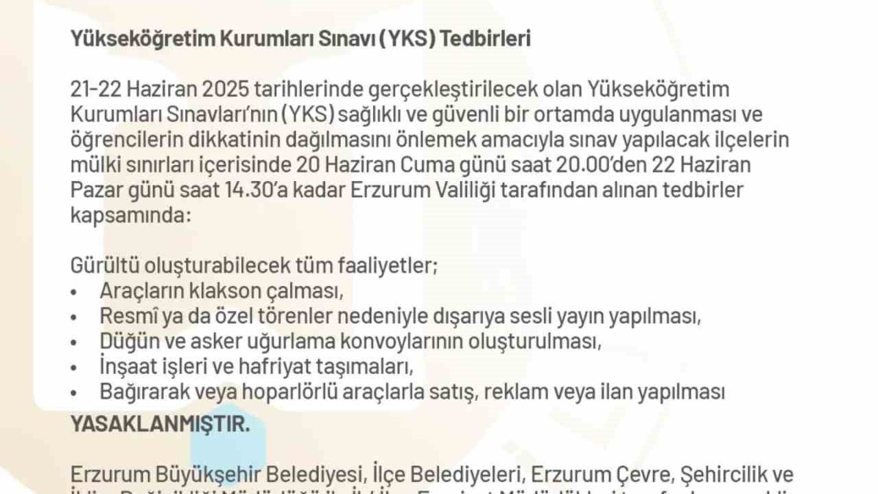 21-22 Haziran 2025 tarihlerinde gerçekleştirilecek olan Yükseköğretim Kurumları Sınavları’nın (YKS) sağlıklı ve güvenli bir ortamda uygulanması ve öğrencilerin dikkatinin dağılmasını önlemek amacıyla sınav yapılacak ilçelerin mülki sınırları içerisinde 20 Haziran Cuma günü saat 20.00’den 22 Haziran Pazar günü saat 14.30’a kadar Erzurum Valiliği tarafından alınan tedbirler kapsamında: "Gürültü oluşturabilecek tüm faaliyetler; araçların klakson çalması, resmî ya da özel törenler nedeniyle dışarıya sesli yayın yapılması, düğün ve asker uğurlama konvoylarının oluşturulması, inşaat işleri ve hafriyat taşımaları, bağırarak veya hoparlörlü araçlarla satış, reklam veya ilan yapılması yasaklanmıştır" denildi.