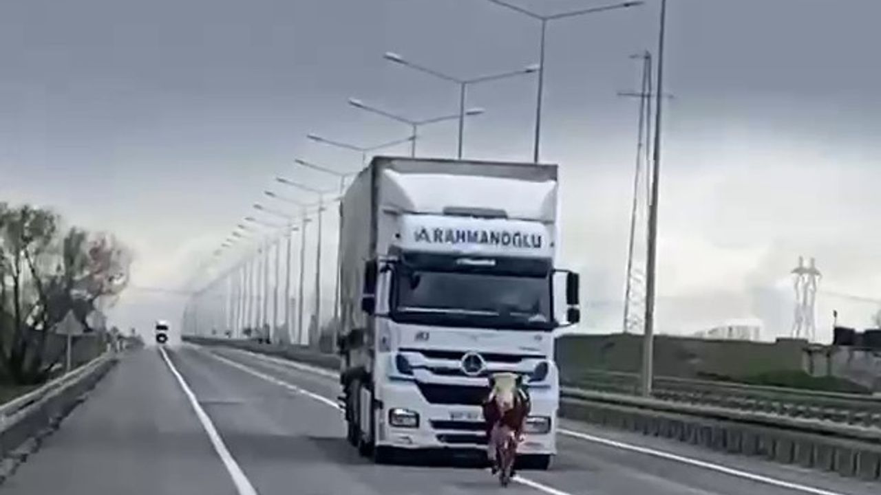 Sahibinden kaçan ve Kuzey Çevre Yolu’na çıkan bir tosun uzun süre yolda seyir halindeki tırın önüne geçerek yoluna devam etti. Hayvanın zarar görmemesi ve trafikte kazaya sebep olmaması için dikkatli davranan sürücü ise sabırla yoluna devam etti, zaman zaman arkadan gelen araçlara engel olmak için yolu kapattı. Bir süre sonra hayvan yoldan çıkarak herkese rahat bir nefes aldırdı.