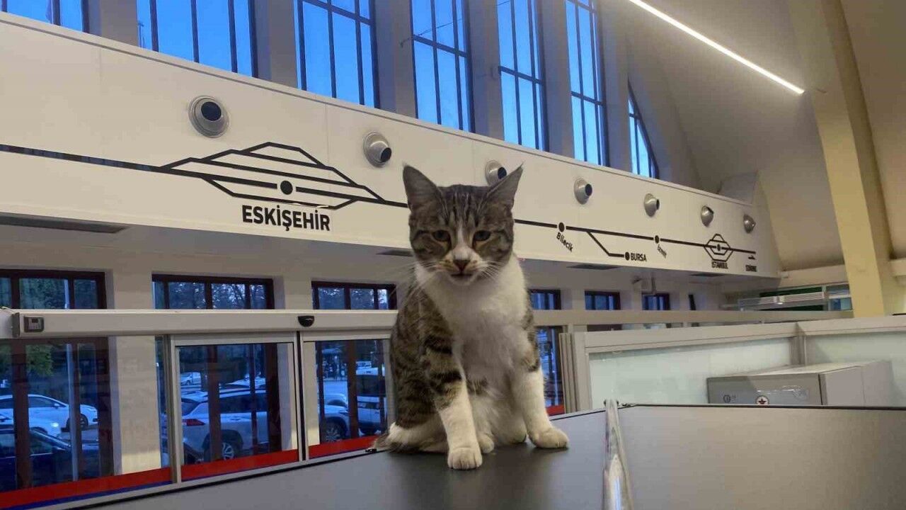 Eskişehir Tren İstasyonu’na sürekli girip çıkan ve oturaklarda uyuyan sevimli kediler, yolcuların ilgi odağı oluyor.