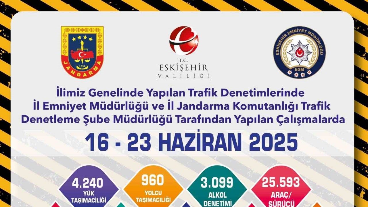 Eskişehir İl Emniyet Müdürlüğü ve İl Jandarma Komutanlığı Trafik Denetleme Şube Müdürlüğü’nce 16-23 Haziran tarihlerinde çeşitli trafik denetimleri gerçekleştirildi. Yapılan çalışmalar kapsamında; 4 bin 240 yük taşımacılığı, 960 yolcu taşımacılığı, 25 bin 593 sürücü ve bin 657 adet motosiklet denetlendi. Ayrıca 3 bin 99 alkol denetimi, 6 bin 957 emniyet kemeri denetimi ve 8 bin 680 diğer kontrol türlerinde denetimler yapıldı. Çalışmalar çerçevesinde toplam 265 araç trafikten men edildi ve 7 bin 10 adet trafik cezası kesildi, 89 sürücü belgesine ise el konuldu.