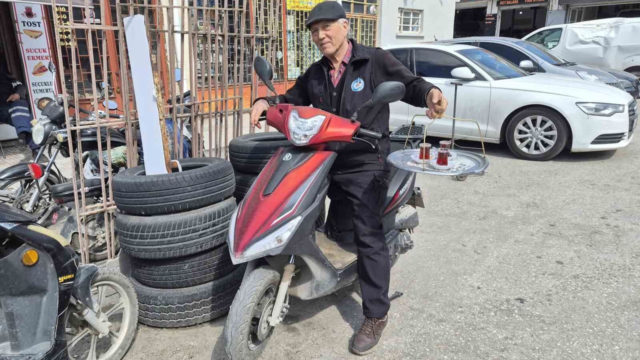 Eskişehir'de 44 senedir çay ocağı işleten 72 yaşındaki Cahit Çandemir, bir eline çay bardaklarıyla dolu tepsiyi alıp, diğer eliyle kullandığı elektrikli motosikleti ile dağıtım yapıyor.