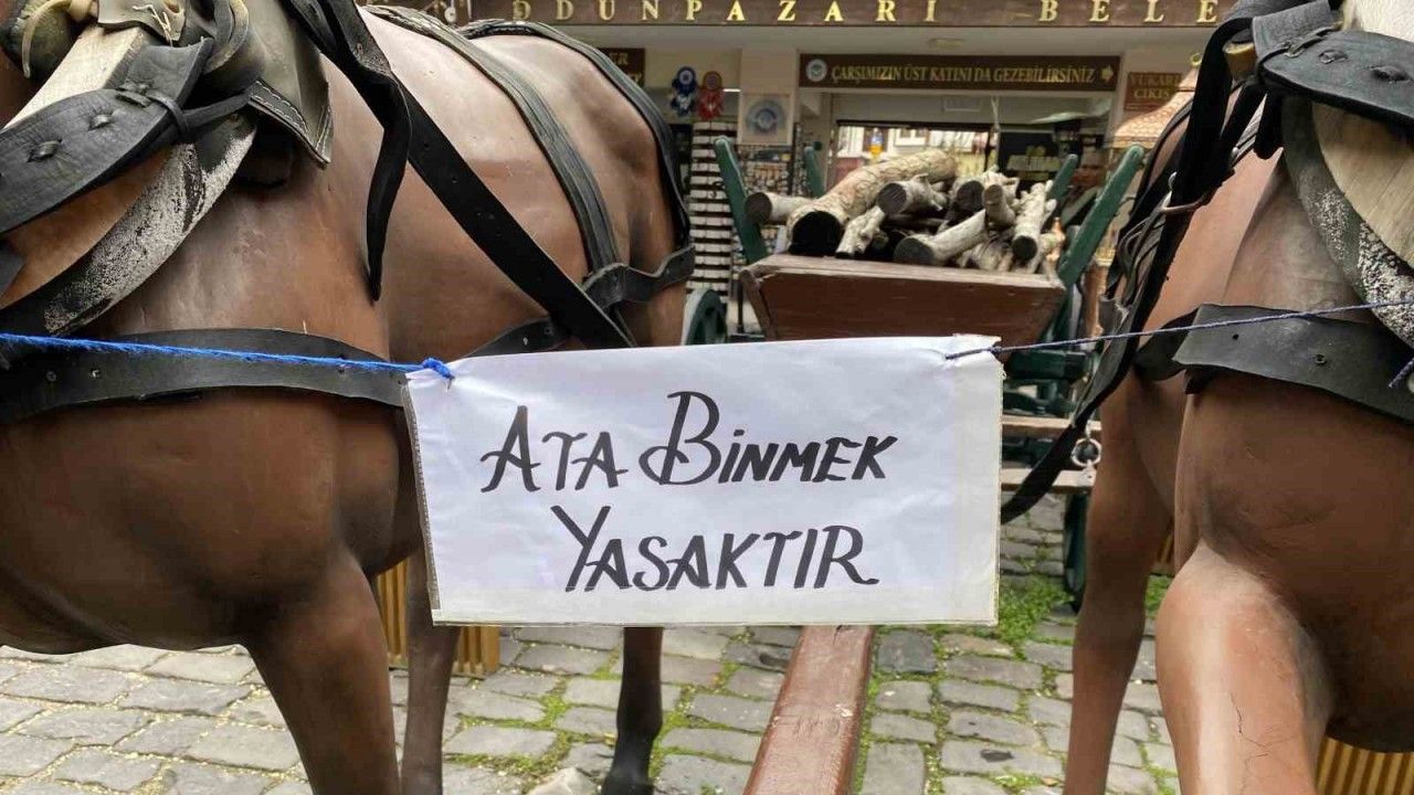 Odunpazarı İlçesi’nde bulunan Tarihi Atlıhan El Sanatları Çarşısı, Eskişehir’in en önemli turistik merkezlerinden biri olarak yerli ve yabancı turistleri karşılamaya devam ediyor. Çarşıda bulunan at heykelleri ise, gelen ziyaretçiler tarafından ilgiyle karşılanıyor. Pek çok fotoğrafın arka planında yer alan at heykelleri ve at arabasının üzerindeki yazı ise görenlere kısa süreli bir şok yaşatıyor. Heykellerin arasına asılmış olan "Ata binmek yasaktır" uyarısına bazı vatandaşlar tarafından anlam verilemezken, bazı ziyaretçileri ise gülümsetiyor. Ortaya çıkan bu ilginç durum, fotoğraf karelerinde esprili bir detay olarak yer almaya devam ediyor.