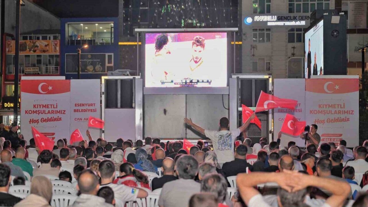 Esenyurtlular, Cumhuriyet Meydanı’nda ekran başında bir araya gelerek ay-yıldızlı ekibimizin mücadelesini heyecanla izledi. Final heyecanına ortak olan binlerce vatandaş, milli takımı ayakta alkışladı.