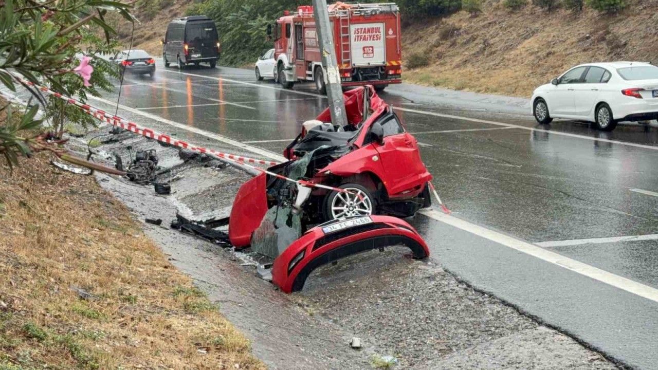 Eyüpsultan’da etkili olan sağanak yağış nedeniyle kayan yolda direksiyon hakimiyetini kaybeden sürücü aydınlatma direğine çarptı. Adeta kağıt gibi katlanan otomobilin içinde sıkışan sürücü Erkan Soytürk hayatını kaybetti.