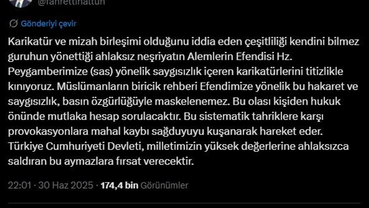"Karikatür ve mizah dergisi olduğunu iddia eden birtakım kendini bilmez güruhun yönettiği ahlaksız neşriyatın Alemlerin Efendisi Hazreti Peygamberimize (s.a.s.) yönelik saygısızlık içeren karikatürlerini şiddetle kınıyoruz. Müslümanların biricik rehberi Efendimize yönelik bu hakaret ve saygısızlık, basın özgürlüğüyle maskelenemez. Bu hastalıklı zihniyetten hukuk önünde mutlaka hesap sorulacaktır. Bu sistematik tahriklere karşı provokasyonlara mahal vermeden sağduyuyu kuşanarak hareket etmeliyiz. Türkiye Cumhuriyeti Devleti, milletimizin yüksek değerlerine ahlaksızca saldıran bu aymazlara fırsat vermeyecektir."