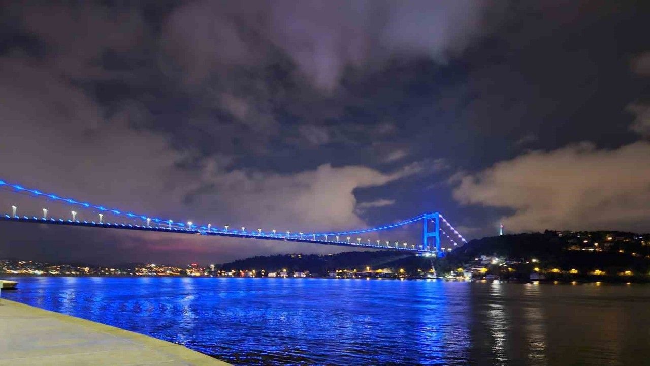 Kamuda Çalışan Engelliler Derneği girişimleriyle Karayolları Genel Müdürlüğü tarafından ışıkla mavi renge bürünen FSM Köprüsü, Beşiktaş’tan görüntülendi.