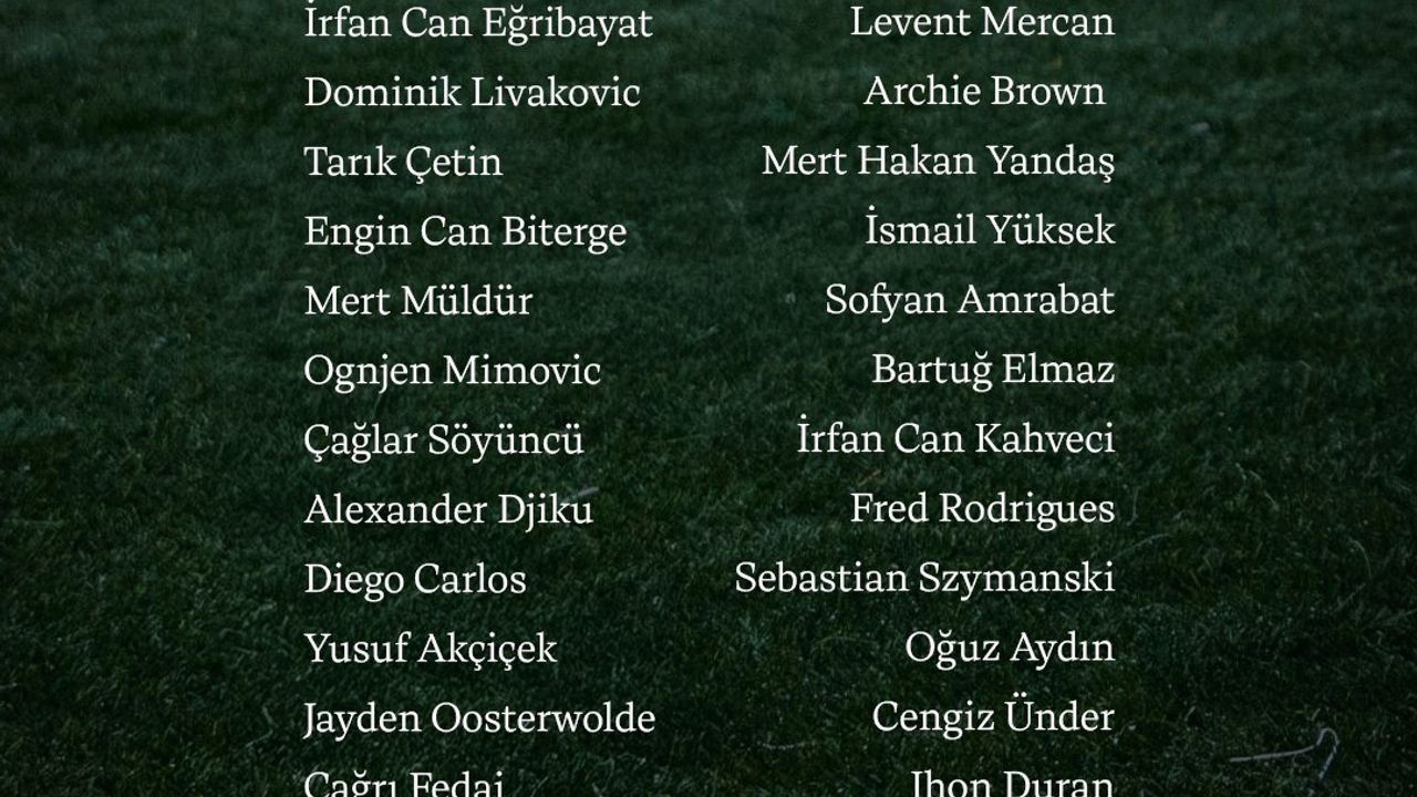 "İrfan Can Eğribayat, Dominik Livakovic, Tarık Çetin, Engin Can Biterge, Mert Müldür, Ognjen Mimovic, Çağlar Söyüncü, Alexander Djiku, Diego Carlos, Yusuf Akçiçek, Jayden Oosterwolde, Çağrı Fedai, Rodrigo Becao, Yiğit Efe Demir, Levent Mercan, Archie Brown, Mert Hakan Yandaş, İsmail Yüksek, Sofyan Amrabat, Bartuğ Elmaz, İrfan Can Kahveci, Fred Rodrigues, Sebastian Szymanski, Oğuz Aydın, Cengiz Ünder, Jhon Duran, Youssef En-Nesyri, Cenk Tosun."
